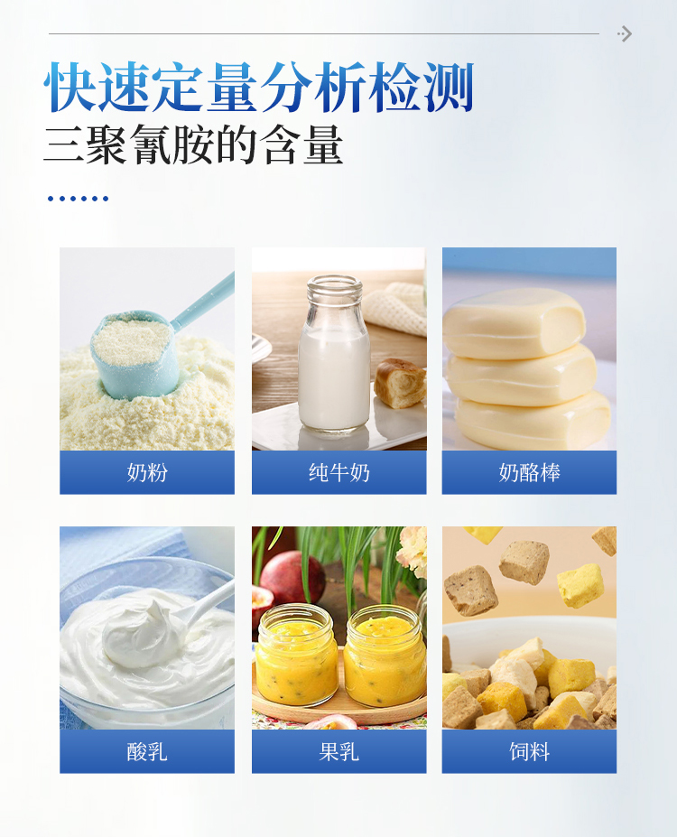 三聚氰胺检测仪可快速定量分析检测奶粉、纯牛奶、酸乳、果乳等奶制品、其它食品以及饲料中的三聚氰胺含量。从原料采购到成品检验均可使用,三聚氰胺检测仪广泛应用于乳制品加工、养殖场、食药监局、卫生部门、农业部门、检验检疫等部门使用。