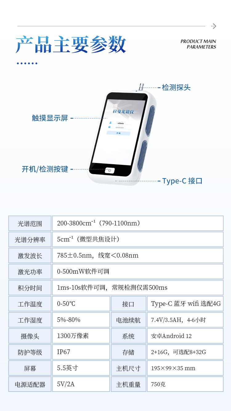 简要描述: 手持式拉曼光谱仪是一种便携式微型共焦拉曼光谱检测设备,基于拉曼散射原理,通过激光激发样品分子振动/转动能级跃迁,获取特征光谱信息,快速识别物质成分,专为快速、无损、高灵敏度的物质分析设计。适用于现场快速检测,广泛应用于医药、公共安全、化学品检测、食品安全、珠宝检测及工业材料分析等多重领域和行业。