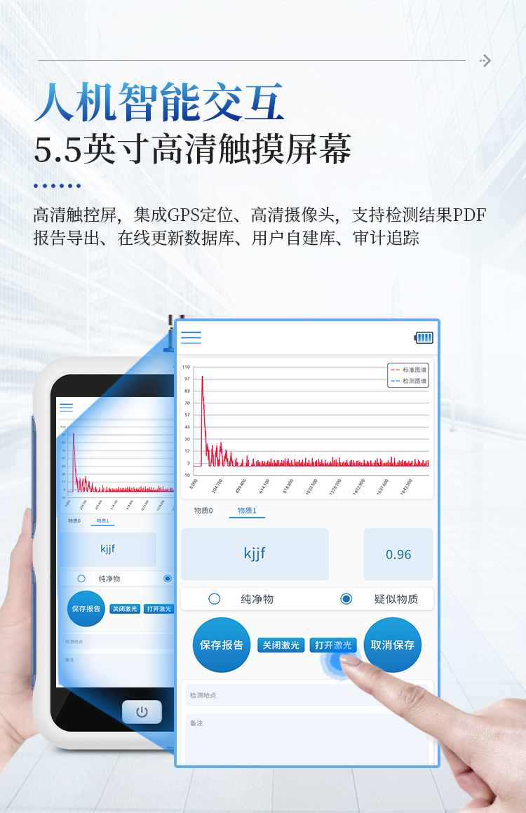 智能交互:高清触控屏,集成GPS定位、高清摄像头,支持检测结果PDF报告导出、在线更新数据库、用户自建库、审计追踪;
