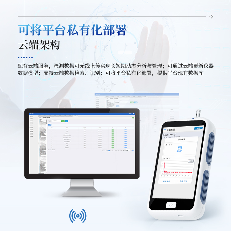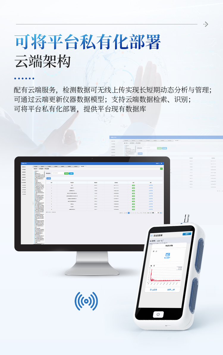 云端架构:配有云端服务,检测数据可无线上传实现长短期动态分析与管理;可通过云端更新仪器数据模型;支持云端数据检索、识别;可将平台私有化部署,提供平台现有数据库;