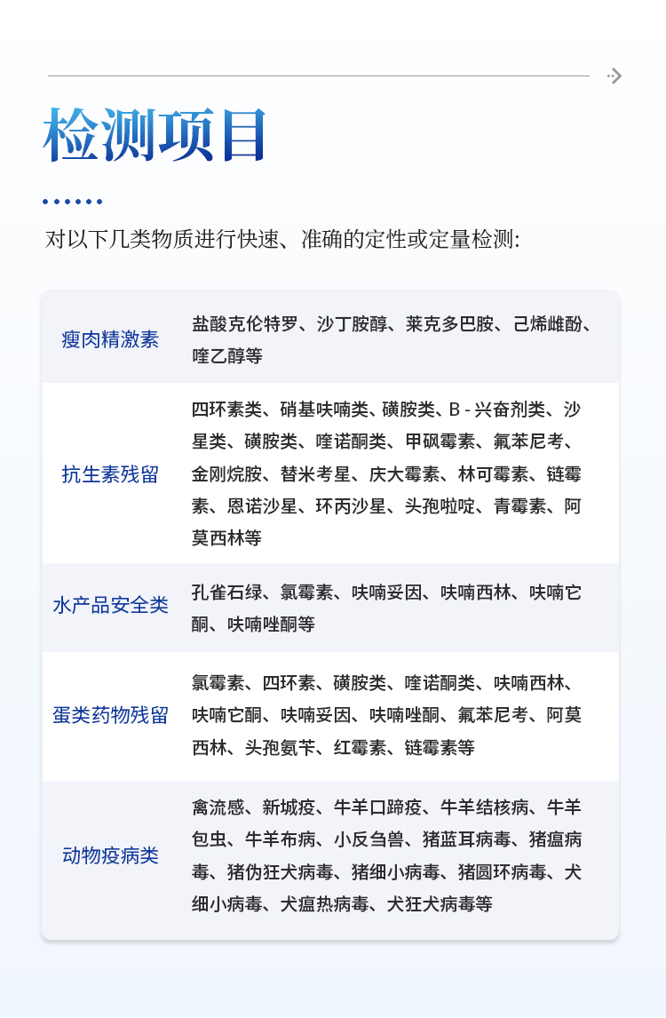 2、 抗生素残留:四环素类、硝基呋喃类、磺胺类、β-兴奋剂类、沙星类、磺胺类、喹诺酮类,甲砜霉素,氟苯尼考,金刚烷胺、替米考星、庆大霉素、林可霉素、链霉素、恩诺沙星、环丙沙星、头孢啦啶、青霉素、阿莫西林等