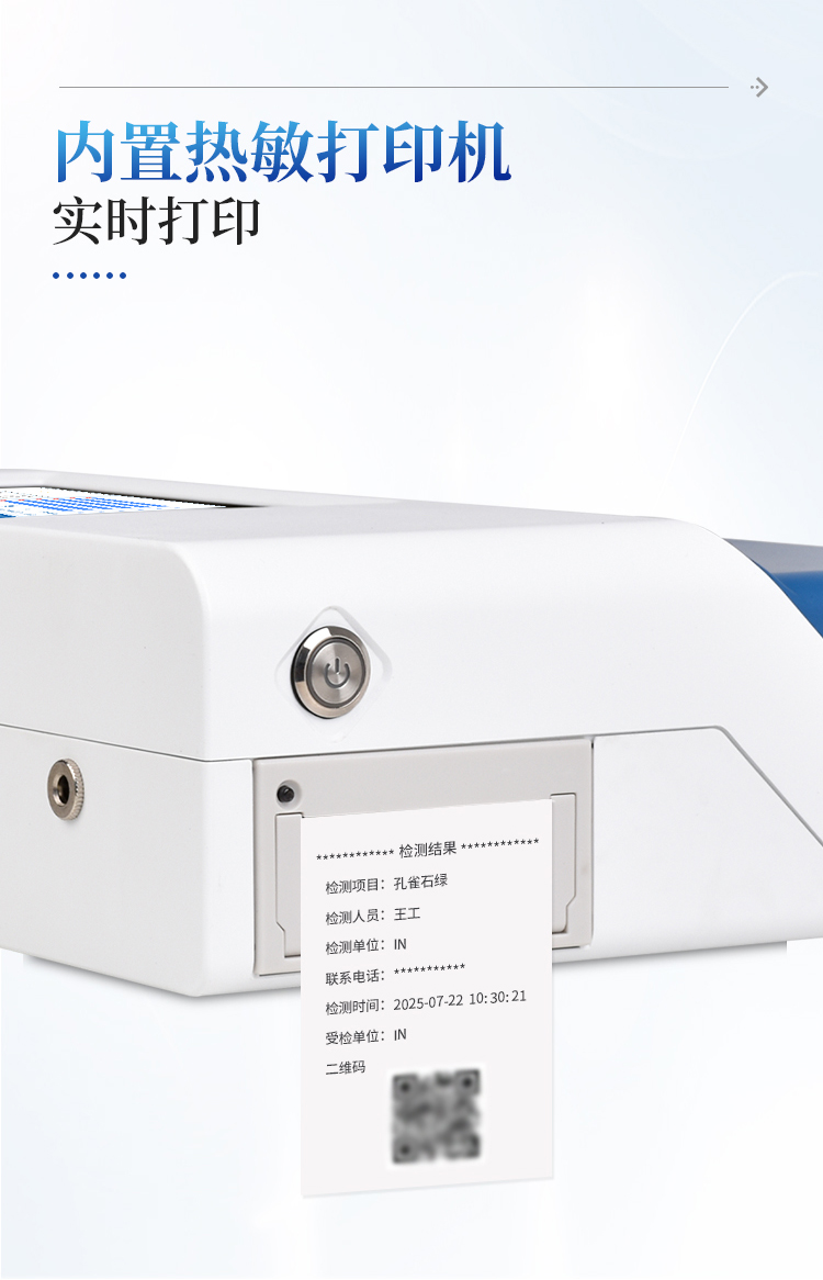 16、检测结果:报告出检测项目、被测物质的浓度、检测单位、被检查单位、检验员、检测时间、检测限等信息可在触摸屏上显示,可通过仪器内置打印机输出