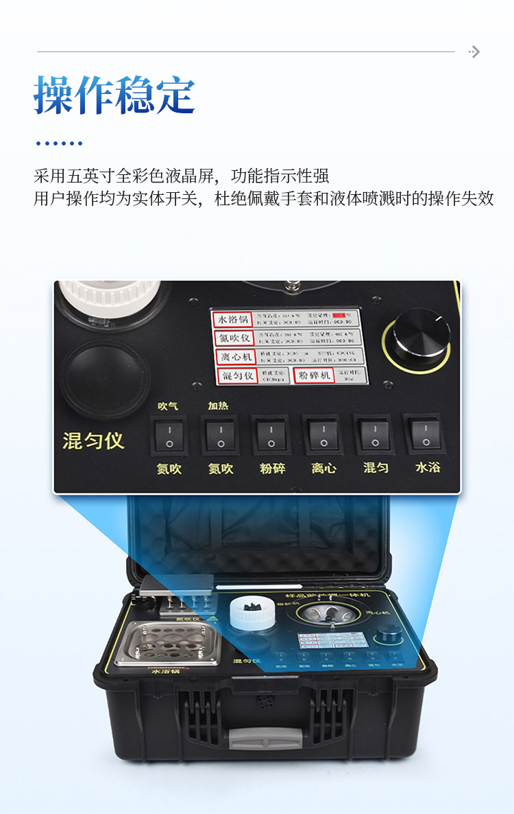 简要描述: QC4型四合一样品检测前处理一体机(箱)是集吹干、离心、均质、混匀功能的一体化整合,极大的简化和集中样品前处理的一般操作过程,结合移动便携的工程塑料箱体,特别适合农兽药残留畜禽水产品质量安全现场快速检测。