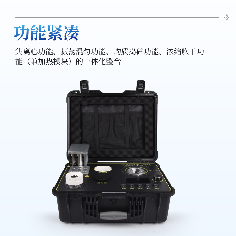 QC4型四合一样品检测前处理一体机(箱)是集吹干、离心、均质、混匀功能的一体化整合,极大的简化和集中样品前处理的一般操作过程,结合移动便携的工程塑料箱体,特别适合农兽药残留畜禽水产品质量安全现场快速检测。